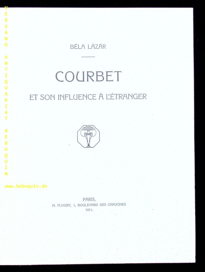 COURBET.– LAZAR, Bela: Courbet et son influence à l’étranger. Paris (Floury), 1911. 4°. 95 (1) S. mit 17 teils farb. Bildtafeln. OHPrgt. mit goldgeprägtem Rücken und goldbronze-marmorierten Deckeln. sehr schönes Ex. EA.