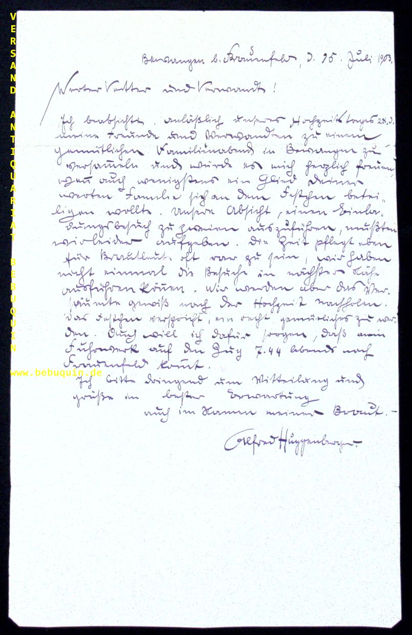 HUGGENBERGER, Alfred: 23zeiliger eigenhändiger datierter und voll signierter Brief. Bewangen, 1903. 36 x 22,5 cm. 1 S. Ecken leicht bestoßen, Rückseite etwas angeschmutzt. Der an den Vetter und Verwandten gerichtete Brief enthält die Einladung zur Hochzeit mit seiner Frau Bertha im 1896 von den Eltern übernommenen Hof in Bewangen.