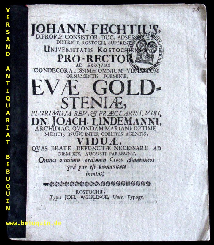 ROSTOCK.– FECHT, Johann: D. Prof. P. Consistor. Duc. Adsessor Et District. Rostoch. Superint. Universitatis Rostochiensis Pro-Rector, Ad Exeqvias Condecoratissimae Omnium Virtutum Ornamentis Foeminae, Evae Goldsteniae, Plurimum Rev. & Praeclariss. Viri, Dn Joach. Lindemanni, Archidiac. Qvondam Mariani Optime Meriti, Nunc inter Coelites Agentis, Viduae, Qvas Beate Defunctae Necessarii Ad Diem XIX. Augusti Parabunt : Omnes omnium ordinum Cives Academicos … invitat. Rostock (Weppling), 1701. kl. 8°. 6 Bl.mit fein gestochenen auch figürlichen Vignetten. IntereimsRücken. gutes Ex. EA. Trauerrede der Universität Rostock für Eva Goldstein, die zweite Gemahlin und Witwe des Rostocker Pastoren Joachim Lindemann.