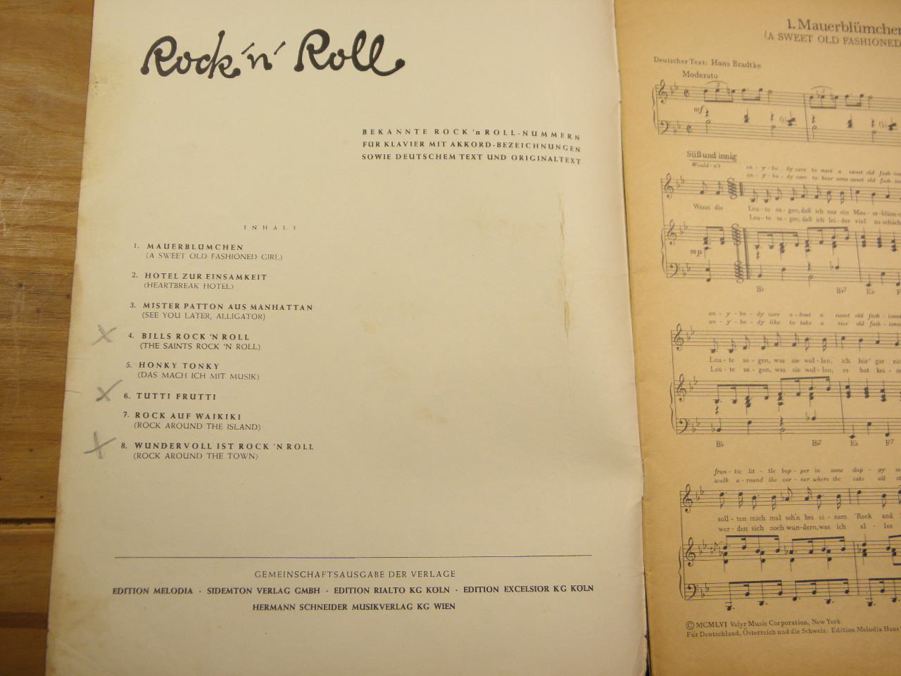 SONGBOOKS.– ROCK’N ROLL.– Bekannte Rock’n Roll – Numern für Klavier mit Akord-Bezeichnungen sowie deutschem Text und Originaltext. Gesang und Klavier. Wien (Schneider), 1956. 4°. 20 S. mit Noten. ill. OKart. etwas bespielt. EA. Inhalt siehe Foto.