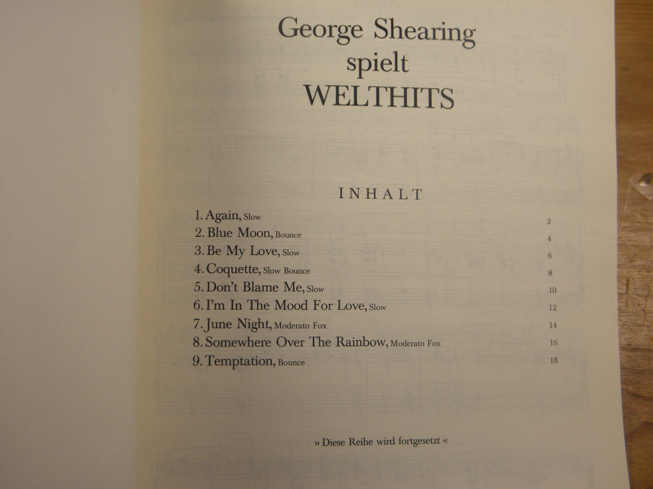 SONGBOOKS.– SHEARING, George: Spielt Welthits. Nr. 1. Klavier. München (Big 3), ca 1970. 4°. 55 S. mit Noten und Bildern. ill. OKart. gutes Ex. EA. Inhalt siehe Foto.