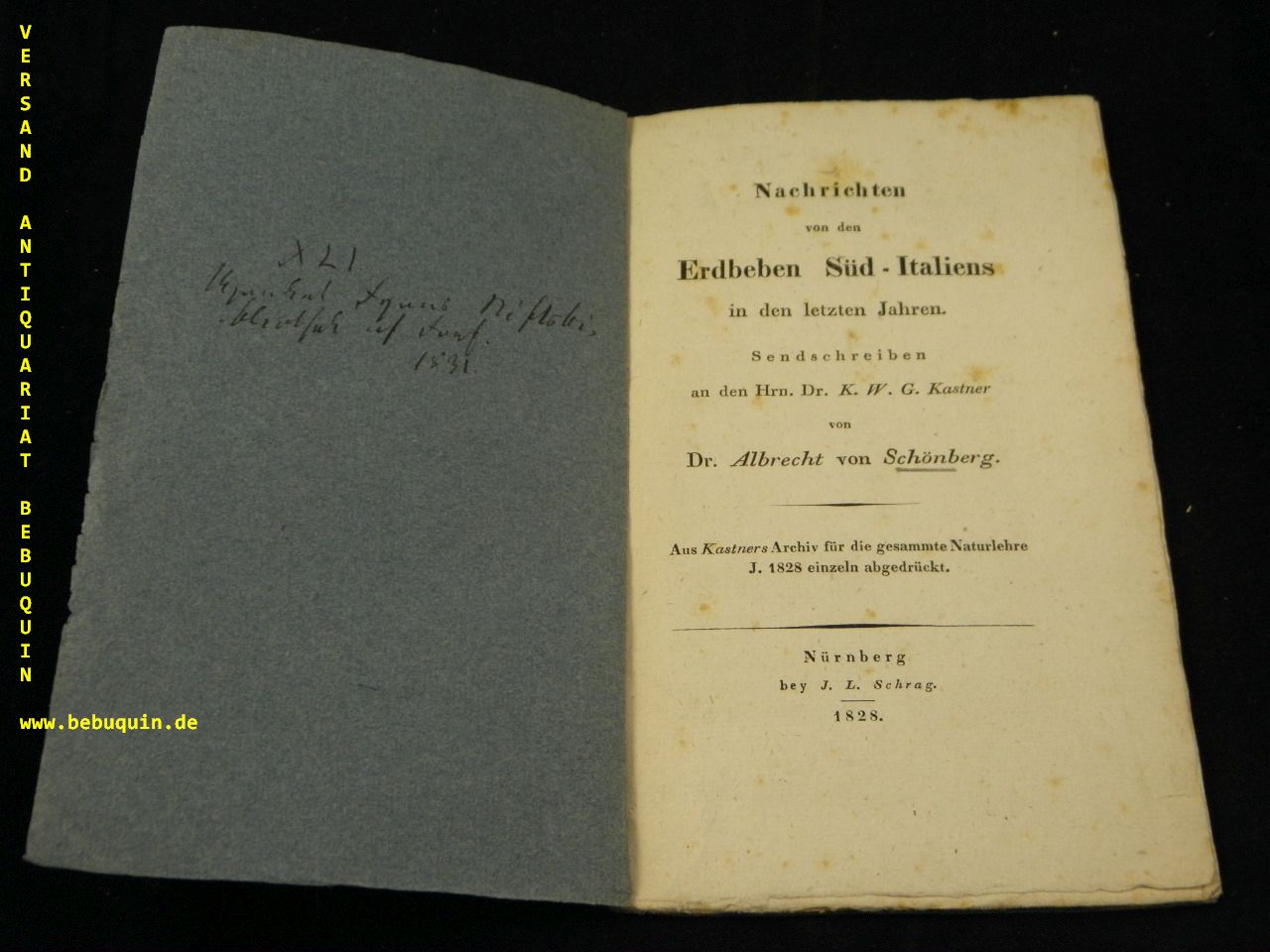 GEOLOGIE.– SCHÖNBERG, Albrecht von: Nachrichten von den Erdbeben Süd-Italiens in den letzten Jahren. Sendschreiben an K.W.G. Kastner. 2. Aufl. Nürnberg (Schrag), 1828. 23 S. OKart. WaV, vereinzelt stockfleckig. EA.