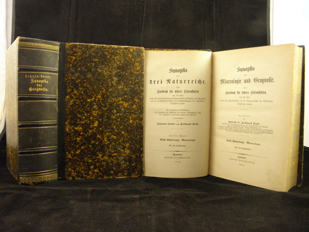 GEOLOGIE.– SENFT, Ferdinand: Synopsis der Mineralogie und Geognosie Ein Handbuch für höhere Lehranstalten und für Alle, welche sich wissenschaftlich mit der Naturgeschichte der Mineralien beschäftigen wollen. 2 Bände. Hahn sche Buchhandl., Hannover, 1876/78. Hannover (Hahn), 1876/78. Gr. 8°. XIX/XV/zus. 1332 S. mit 580, 122, 333 Holzschnitten. HLdr der zeit mit goldgeprägten Rücken. ein Rücken angeplatt, insgesamt gut erhalten. EA. (Carl Friedrich) Ferdinand Senft (* 6. Mai 1808 in Möhra; † 30. März 1893 in Eisenach) war ein deutscher Lehrer, Geologe, Mineraloge, Bodenkundler und Botaniker. (Wikpedia)