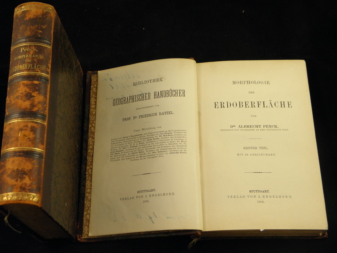 GEOLOGIE.– PENCK, Albrecht: Morphologie der Erdoberfläche. 2 Teile in 2 Bänden. Stuttgart (Engelhorn), 1894 Gr. 8°. XIV, 471 S.; X, 696 S., mit zusammen 67 Abbildungen. HLdr der Zeit mit goldgeprägten Rücken. Rücken berieben, NaV. = Bibliothek Geographischer Handbücher hrsg. v. Friedrich Ratzel. 2 Bände. EA. Albrecht Friedrich Karl Penck (* 25. September 1858 in Reudnitz bei Leipzig; † 7. März 1945 in Prag) war ein deutscher Geograph und Geologe. Penck widmete sich besonders der Geomorphologie, den glazialen Landschaftsformen und der Klimatologie. In der „Morphologie der Erdoberfläche“ (2 Bände, 1894) stellte er methodisch zukunftsweisend das Relief der Erde als Ergebnis formender Prozesse dar. (Wikpedia)