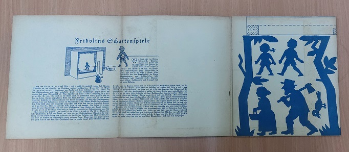 SLING: (D.i. Paul Schlesinger) Hänsel und Gretel. Fridolins Schattenspiele. Mit der Beilage. Berlin (Fridolin), ca 1925. 17 x 19,5 cm. 6 Bl. Leporello mit den plastischen Figuren zum Ausschneiden + 15 S. Beilage. farb. ill. OKart. etwas bestaubt, sonst von spektakulärer Erhaltung. = Fridolins Spielzeug zum Ausschneiden Nr. 12. von musealer Seltenheit. Paul Felix Schlesinger (* 11. Mai 1878 in Berlin; † 22. Mai 1928 ebenda) war ein deutscher Gerichtsreporter und der bekannteste der Weimarer Republik. Er veröffentlichte seine Reportagen unter dem Kürzel Sling. (Wikipedia).