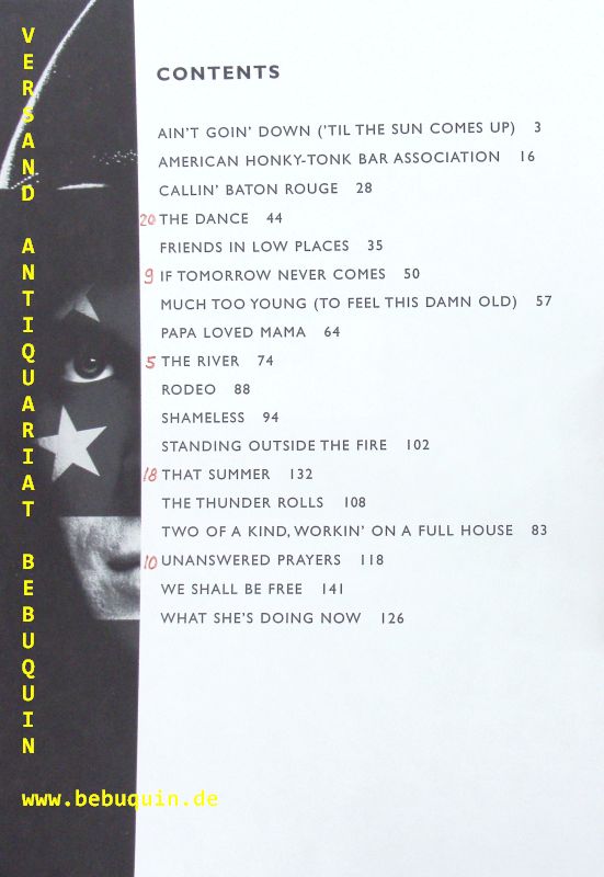 SONGBOOKS.– BROOKS, Garth: The Hits. Authentic Guitar-TAB Edition. USA (Warner), 1994. 4°. 156 S. mit Noten. ill. OKart. gutes Ex. EA. Inhalt siehe Foto.