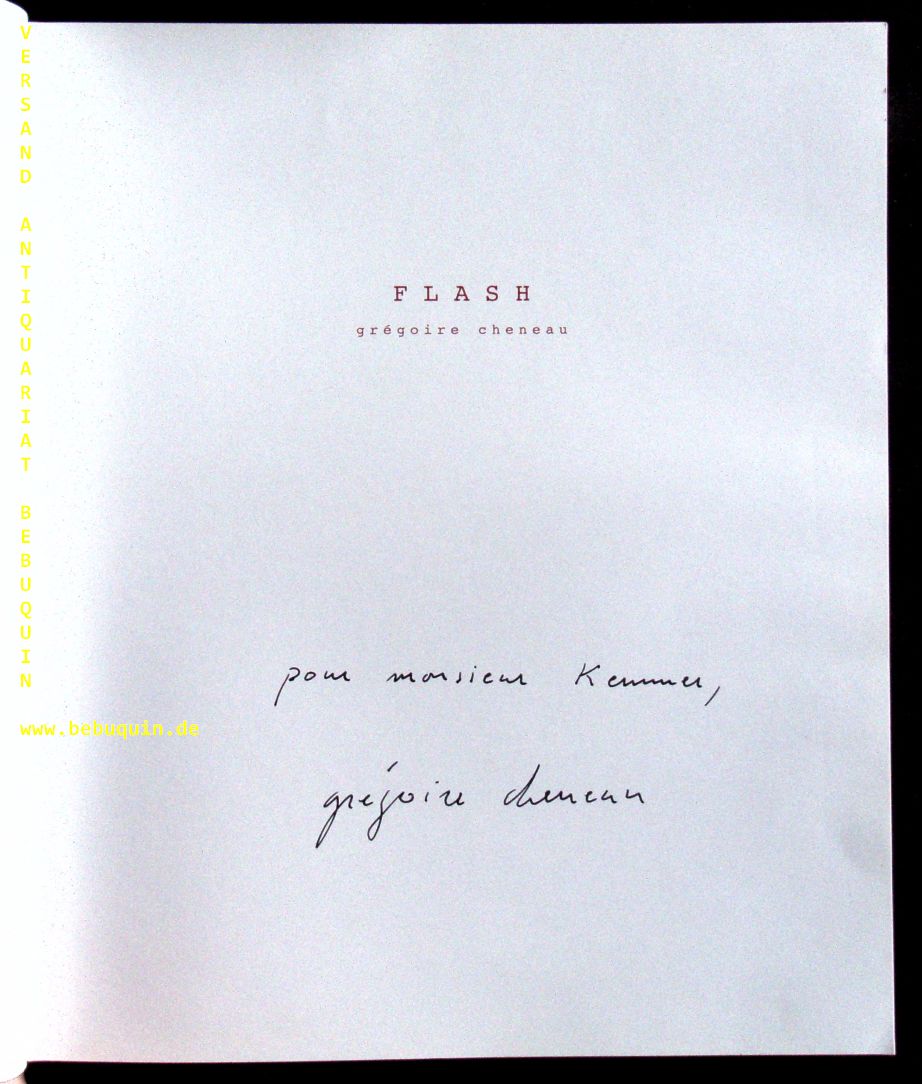 CHENEAU, Gregoire: Flash. Paris (Chenau), 2001. 4°. ca 100 S. mit zahlr. farb. Fototafeln. farb. ill. OKart. feines Ex. EA mit einer eigenhändigen persönlichen voll signierten Widmung des Fotografen auf Titelseite.