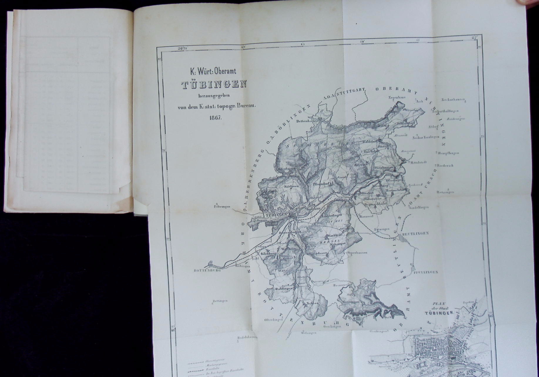 TÜBINGEN.– BESCHREIBUNG DES OBERAMTS TÜBINGEN.– Hrsg. von dem Königlichen statistisch-topographischen Bureau. Stuttgart (Lindemann), 1867. IV, 489 (1) S. + 3 Tabellen, einer Karte des Oberamts und zwei Ansichten. neuer Pb mit aufgesetztem ODeckel. gut erhalten. EA.