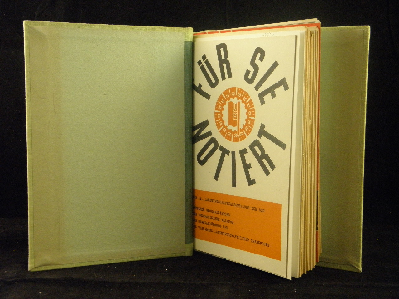DDR.– FÜR SIE NOTIERT und anderes.– ca 30 Hefte zur 12. Landwirtschaftsausstellung der DDR. Leipzig (agra), 1963/64. jeweils 12 – 48 S. mit zahlr. Abb. il. OKart. in goldgeprägtem OLeinen Klemm Ordner. sehr gut erhalten. EA dieser sehr interessanten Sammlung mit landwirtschaftlichen, technischen, züchterischen und ortskundliche Aspekten.