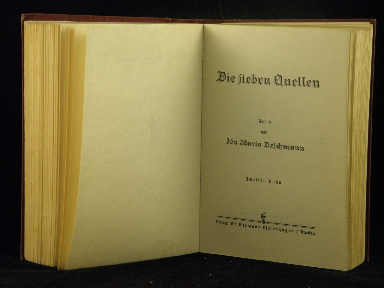 DESCHMANN, Ida Maria: Die sieben Quellen. 2 Bände in 1 Bd. Breslau (Eschenhagen), 1936. 335, 339 S. OLn. Rücken geblichen, kaum gelockert. EA.