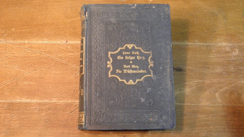 MAY, Karl: Die Wüstenräuber. Erlebnisse einer Africa-Expedition durch die Sahara. Vorgebunden: Bach, Cuno: Ein stolzes Herz. Roman. 246 S. Köln (Bachem), (1885). S. 247 – 408. OLn mit Gold- und Blindprägung. oberes Kap angeplatzt, etwas schiefgelesen, Einband teils angeschmutzt, fliegender Vorsatz lose, dort auch vorderes Gelenk gelockert, sonst im Buchblock fest und insgesamt noch ordentlich. = Bachem’s Roman-Sammlung, Bd. 4.
