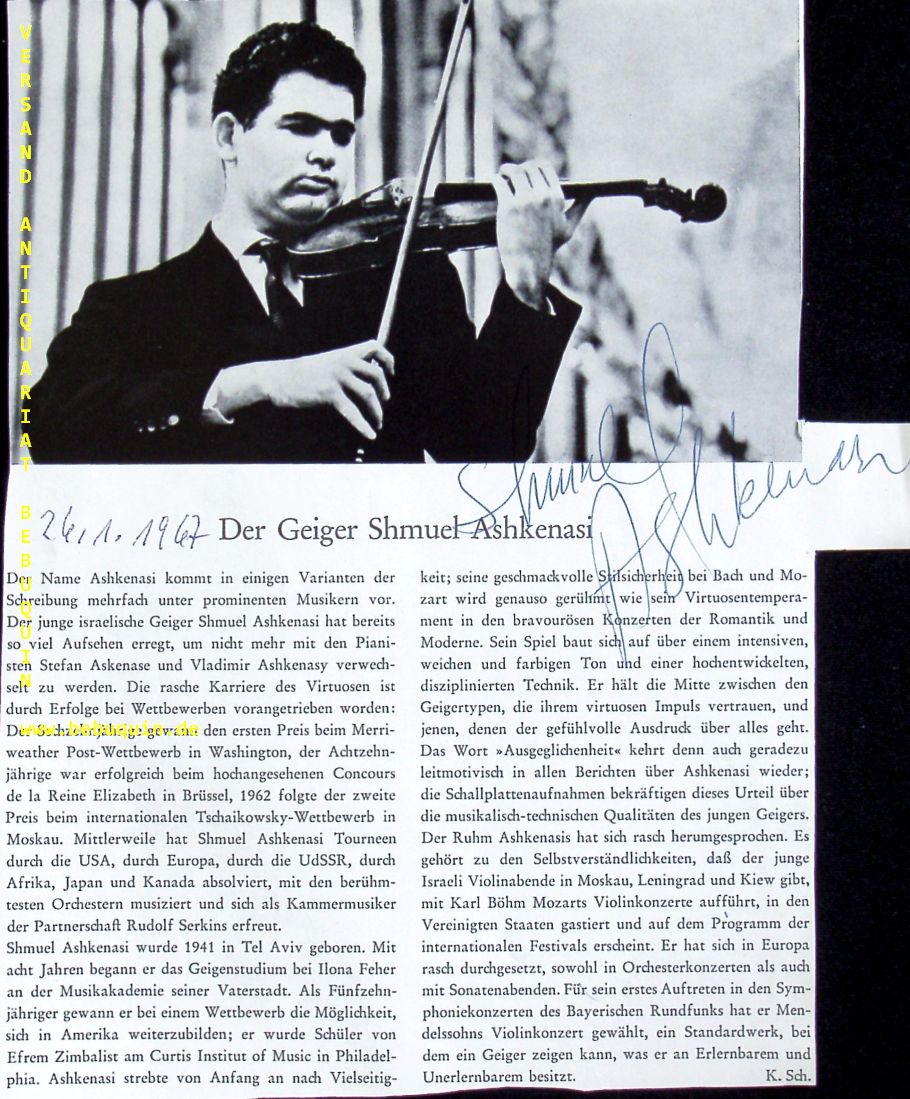 ASHKENAZI, Shmuel (Violonist): eigenhändig mit komplettem Vornamen signierte Portraitseite. München (Philharmonie), 26.1.1967. 21 x 15,5 cm. 1 Bl. Shmuel Ashkenasi (* 11. Januar 1941 in Tel Aviv) ist ein israelischer Violinist und Lehrer. (Wikipedia)