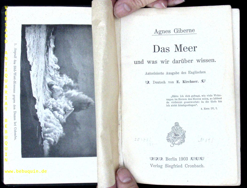 MEERESKUNDE.– GIBERNE, Agnes: Das Meer und was wir darüber wissen. D.v. E. Kirchner. Berlin (Cronbach), 1903. VIII, 228 S. mit zahlr. Bidlern. Ln der Zeit. leicht wasserrandig. dt. EA.