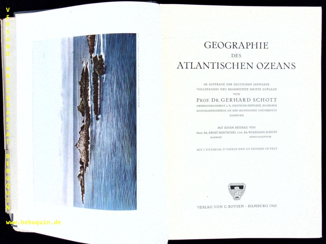 MEERESKUNDE.– SCHOTT, Gerhard: Geographie des Atlantischen Ozeans. Im Auftr. d. Dt. Seewarte. 3. Aufl. / Mit e. Beitr. v. Ernst Hentschel ; Wolfgang Schott. Hamburg, C. Boysen, 1942. 4°. XVI, 438 S. Mit 1 Titelb., 27 Taf. u. 141 Fig. im Text, 1 Kt. OHLn mit OUmschl. Umschlag am Rand lädiert, Vorsatz und Titelseite mit Randabschnitt im Weiß.
