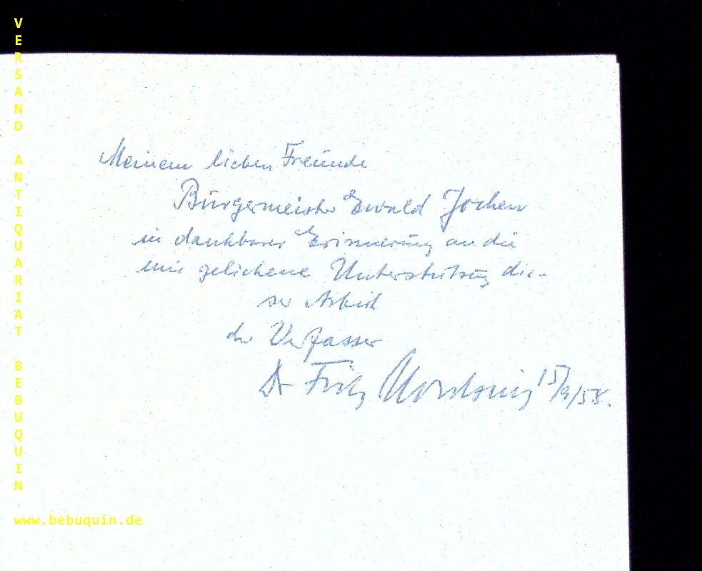 FISCHE.– NORDSIECK, Fritz: Meeresschnecken. Vom wunderlichen Treiben unbewusster Künstler. Stuttgart (Franckh), 1958. 4°. 63 S. + 51 Farbtafeln. OLn mit Goldprägung. EA mit einer eigenhändigen persönlcien signierten und datierten 7zeiligen Verfassewidmung an Bürgermeister Ewald Jochen.