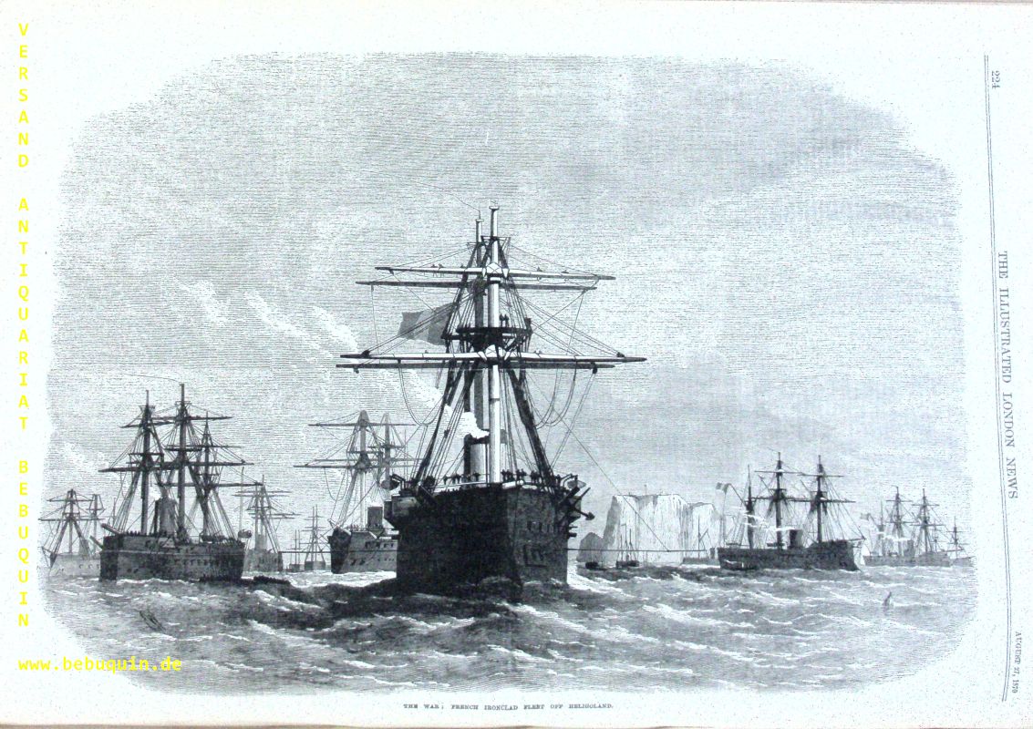THE ILLUSTRATED LONDON NEWS.– Vol. LVII. Hrsg. von John Lash. Juli bis Dezember 1870. London (Leighton), 1870. 41 x 30 cm. IV, 692 S. mit Hunderten von Holzschnittillustrationen aller Größen und Inhalte sowie 1 gefalteter Kriegsplan. ill. OLn mit Gold- und Blindprägung. alter Rücken neu aufgezogen, Doppeltafeln mit Bindefehler, sonst gut. Eine Auswahl der Motive: Railway Accident rear Newark, Meeting of the Agricultural Society at Oxford, All-England Croquet Club at Wimbledon, A Sketch at Birmingham Cattle-Show, Scenes in China: I-Chang Gorge on the Upper Yang-Tze-Kiang, Christmas in Australia, Prize Dogs at the Birmingham Show, Prize Dogs at the Crystal Palace, Paris Fashion for July, India: The Oghee Punjaub Frontier Post, Spinning Net Thread in the Claddagh Ireland, Appearance of the Plantet Jupiter, Scenes in Paris: Arrest of a Supposed Prussian Spy on the Boulevard de Italians Paris, The Halles Centrales, Balloon from Paris Passing over Versailles, Battle of Sedan, French Prisoners on the Road from Sedan, Guns Captured by Prussians at Sedan, Map of the Country Around Chalons, The Siege of Metz: Imperial Guard, Prussian Advance Post at Mercy Le Haunt, View of the South West, The Fight at Mouzon, The Sedge and Defence of Paris: Burning Houses to Clear Space to before Fort Bicetre, A Captive Balloon at Montmatre, Departures of Americans and English, Gun-Boats on the Seine, Troops of the Regular Army encamped in the Champs Elysees, Battle at Villejuif, Prussian Spies Brought into Paris, French Guns and Fortifications, Waiting at Le Mans for a Train to Tours. Sehr interessanter Jahrgang zum Deutsch/Französischen Krieg 1870/71.