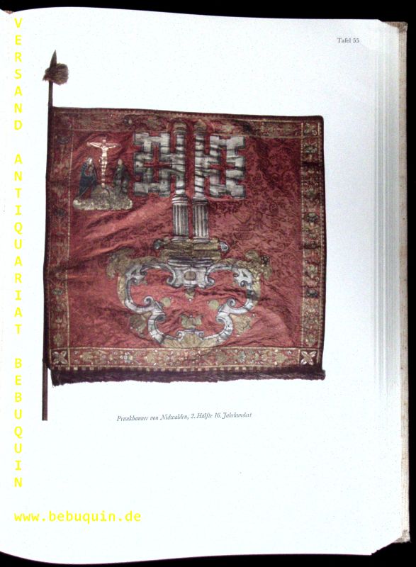 HERALDIK.– BRUCKNER, Albert: Schweizer Fahnenbuch. Vorw. v. Philipp Etter. Geleitw. v. Henri Guisan. St. Gallen (Zollikofer), 1942. Gr. 4“. XXXXIII/384 S. mit zahlr. zT. ganzseitigen S/W-Abb. sowie 88 Farbtafeln, des weitern Fahnenkatalog (175 S.) mit 1116 Positionen, teilw. abgebildet. OLn mit weißerhöhtem Kreuz auf rotem Grund. gutes Ex. EA.