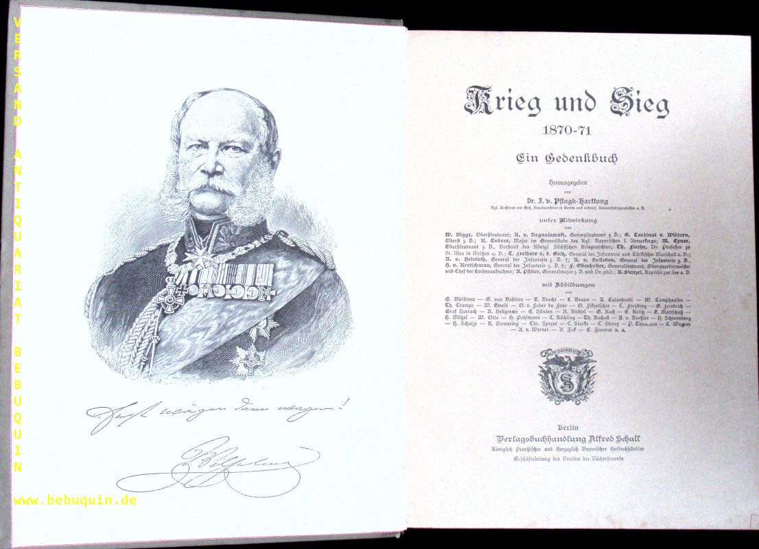 1870/71.– PFLUGK-HARTTUNG, J. von: Krieg und Sieg. 1870-71. Ein Gedenkbuch. Berlin (Schall & Grund), 1895. 4°.ö XI, 645 [4] S. mit zahlr. teils gefalteten Abb., Bildtafeln und Karten. reich verziertes OLn mit Goldprägung. vereinzelt braunfleckig. EA.