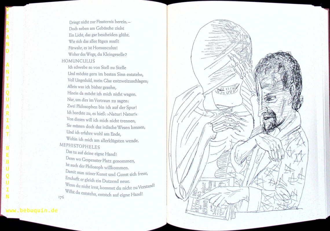 BECKMANN.– GOETHE, Johann Wolfgang von: Faust II. Der Tragödie Zweiter Teil. Frankfurt (Goldene Brunnen), 1957. 4°. 408 S. mit 35 ganzseitigen Holzstichen von Willi Seidl nach Zeichnungen von Max Beckmann. OLn. Ex libris von Rolf Dettling, sonst tadellos. EA mit den Illustrationen von Beckmann, welche bereits 1943 und 1944 entstanden.