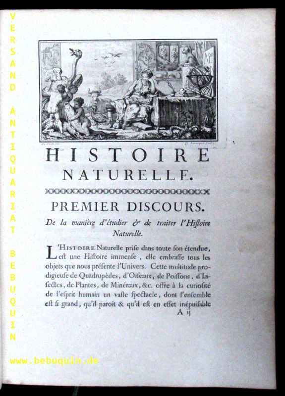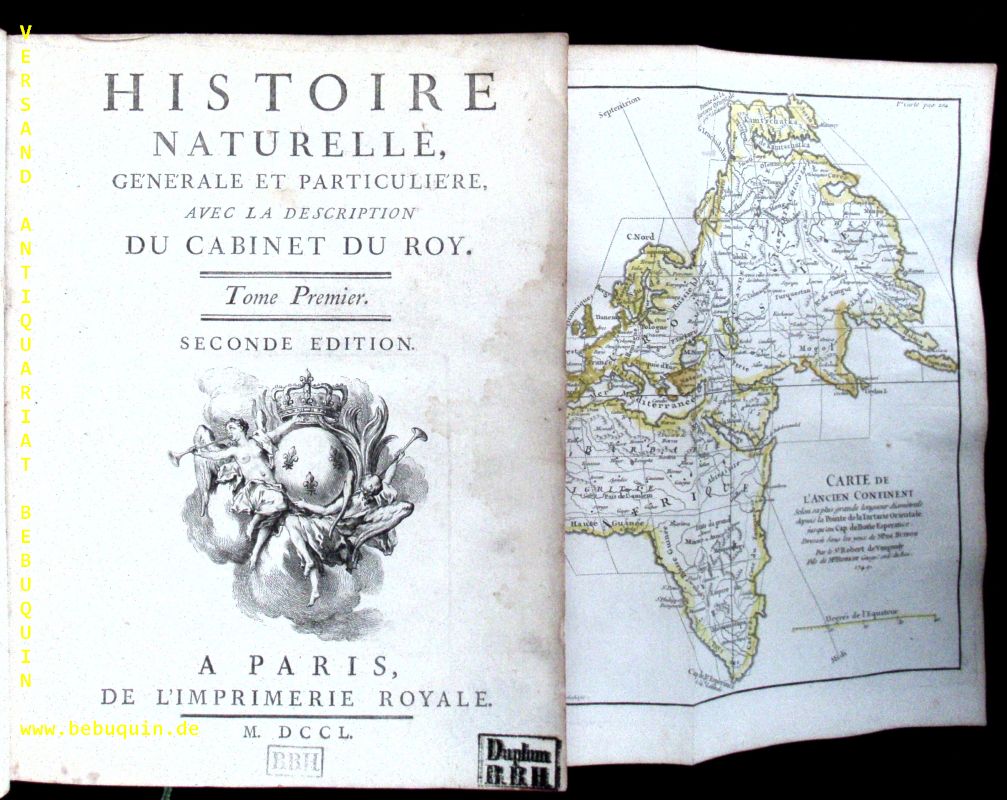 NATURKUNDE.– BUFFON, Georges Louis Le Clerc de: Histoire Naturelle, Générale Et Particulière. Avec La Description Du Cabinet Du Roy. 1. Bd. Seconde Édition. Paris (Imprimerie Royale), 1750. 4°. 4 Bl., 612 S. mit gestochener Titelvignette, 3 Titelkupfern, 2 Kupfertafeln und II grenzkolorierte gestochene Faltkarten sowie dreiseitigem Rotschnitt. OLdr auf 6 Bünden mit goldgeprägtem Rücken. Kanten etwas berieben, teils etwas wasserrandig, insgesamt gut erhalten. Georges-Louis Leclerc, Comte de Buffon (* 7. September 1707 in Montbard; † 16. April 1788 in Paris) war ein französischer Naturforscher im Zeitalter der Aufklärung.
