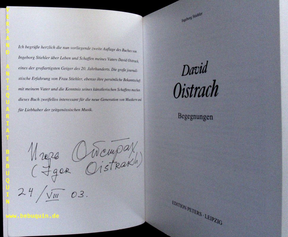 OISTRACH.– STIEHLER, Ingeborg: David Oistrach. Begegnungen. 2., erw. Aufl. Leipzig (Peters), 2004. Gr. 8°. 180 S. mit zahlr. Ill. ill. OKart. Mit einer eigenhändigen signierten und datierten Widmung von Igor Oistrach auf Vorsatz.