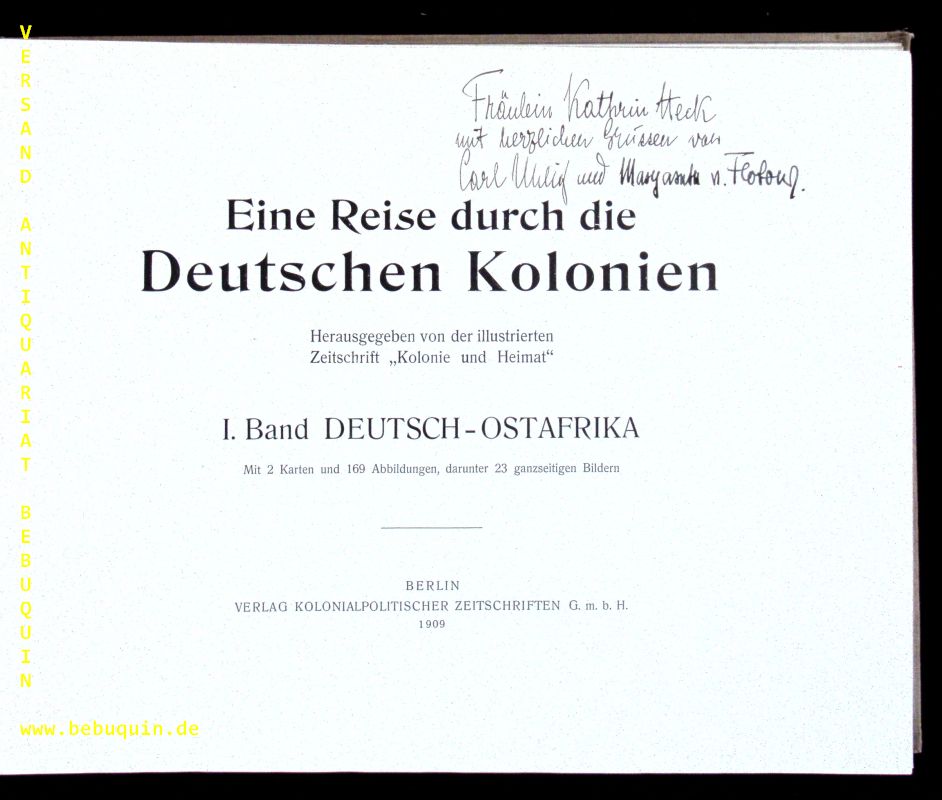 KOLONIEN.– UHLIG, Carl.– Eine Reise durch die deutschen Kolonien. Bd. 1: Deutsch-Ostafrika. Berlin (Kolonialpolit. Zeitschriften), 1909. Quer Gr. 4°. VIII, 127 S. mit 2 Karten und 169 Abbildugen, darunter 23 ganzseitigen Bildern. farb. ill. OLn. Rückenschild überklebt, leicht geloclert, sonst gut. EA mit einer eigenhändigen voll signierten Widmung von Carl Uhlig und Margarete Flobour auf Titelseite. Carl Uhlig war Professor für Geographie in Tübingen, unternahm ausgedehnte Forschungsreisen durch Rußland und Transkaukasien, in die USA, nach Palästina sowie nach Afrika. Nach dem Besuch des von seinem Vater geleiteten Heidelberger Gymnasiums studierte U. 1890–96 in seiner Heimatstadt, in Halle/Saale und Göttingen Geographie und Naturwissenschaften. 1900 wurde U. im Dienst der Kolonialabteilung des Auswärtigen Amtes nach Dt.-Ostafrika entsandt. Hier übernahm er die Leitung der meteorologischen Station in Daressalam und war zeitweise auch für die Landesaufnahme der Kolonie verantwortlich. Während seines Dienstes in Ostafrika unternahm U. mehrere Forschungsreisen, darunter 1901 zum Kilimandscharo und zum Meru. Nach seinem Ausscheiden 1906 aus dem Kolonialdienst ließ sich U. wieder in Berlin nieder, wo er am Institut für Oriental. Sprachen der Universität Landeskunde von Dt.-Ostafrika lehrte und im Vorstand der Dt. Kolonialgesellschaft mitwirkte. 1908 habilitierte sich U. in Berlin für Geographie, zwei Jahre später erhielt er einen Ruf als Nachfolger Karl Th. Sappers (1866–1945) auf das Ordinariat in Tübingen (Rektor 1927/28, em. 1937). Bevor er seinen Hochschuldienst im Herbst 1910 antrat, reiste U. erneut nach Dt.Ostafrika, um Lagerstätten zu prospektieren.