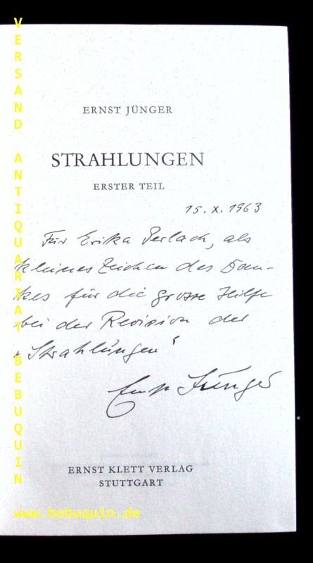 JÜNGER, Ernst: Strahlungen. Erster und Zweiter Teil. 2 Bände. Stuttgart (Klett), (1963 ). 517, 686 S. grünes OLn. recht rare EA WG² 97. Hier mit einer 7zeiligen eigenhändigen voll signierten und datierten Widmung auf Titelseite: Für Erika Gerlach, als kleines Zeichen des Dankes für die grosse Hilfe bei der Revision der „Strahlungen“. Weiterhin das Ex Libris von Ernst Jünger auf dem Innendeckel von Band 2, sowie der mont. Samenstand einer Pflanze datiert auf den 15.X.1963 mit der eigenhändigen Monogrammzeichnung Jüngers auf der letzten Textseite. (Hier ist der Kleber etwas durchgeschlagen). Weiterhin inliegend diverse