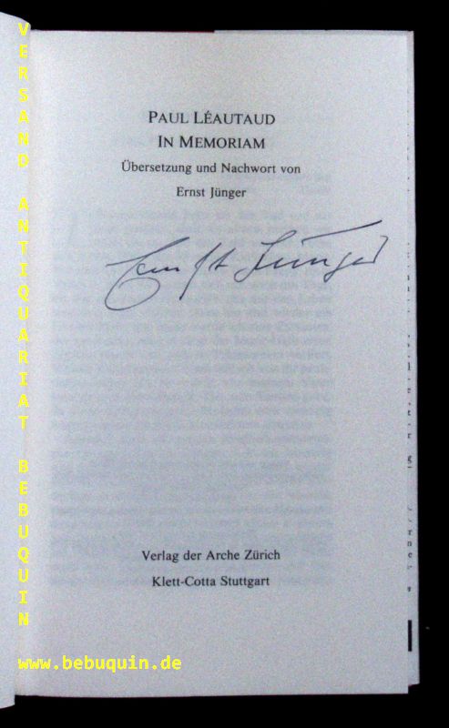 JÜNGER, Ernst.– LEAUTAUD, Paul: In Memoriam. Übersetzt und Nachwort von Ernst Jünger. Zürich (Arche), 1965. 84 S. OPb. mit OUmschl. dt. EA mit einer eigenhändigen Unterschrift Ernst Jüngers auf Titelseite.