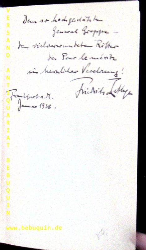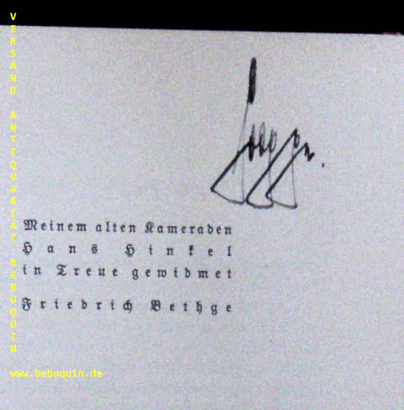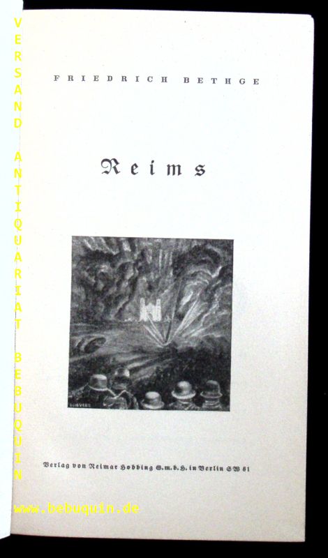 GROPPE.– BETHGE, Friedrich: Reims. Berlin (Hobbing), 1934. 93 S. mit 4 Doppeltafeln von L. Sievert und Titelvignette. ill. OHLn. oberes Kap. etwas angeplatzt, sonst gut. EA mit einer 8zeiligen voll signierten und datierten (1938) Verfasserwidmung an „den so hochgeschätzten General Groppe – den vielverwundeten Ritter des Pour le mérite in herzlicher Verehrung″ auf dem Vorsatz sowie der eigenhändigen Signatur Groppes auf der Widmungsseite. Theodor Groppe, auch der Schwarze General genannt, (* 16. August 1882 in Trier; † 28. April 1973 ebenda) war ein deutscher Generalleutnant im Zweiten Weltkrieg. Aufgrund seiner regimekritischen Haltung wurde er 1933 und Ende 1941 aus der Wehrmacht entlassen. (Wikipedia)