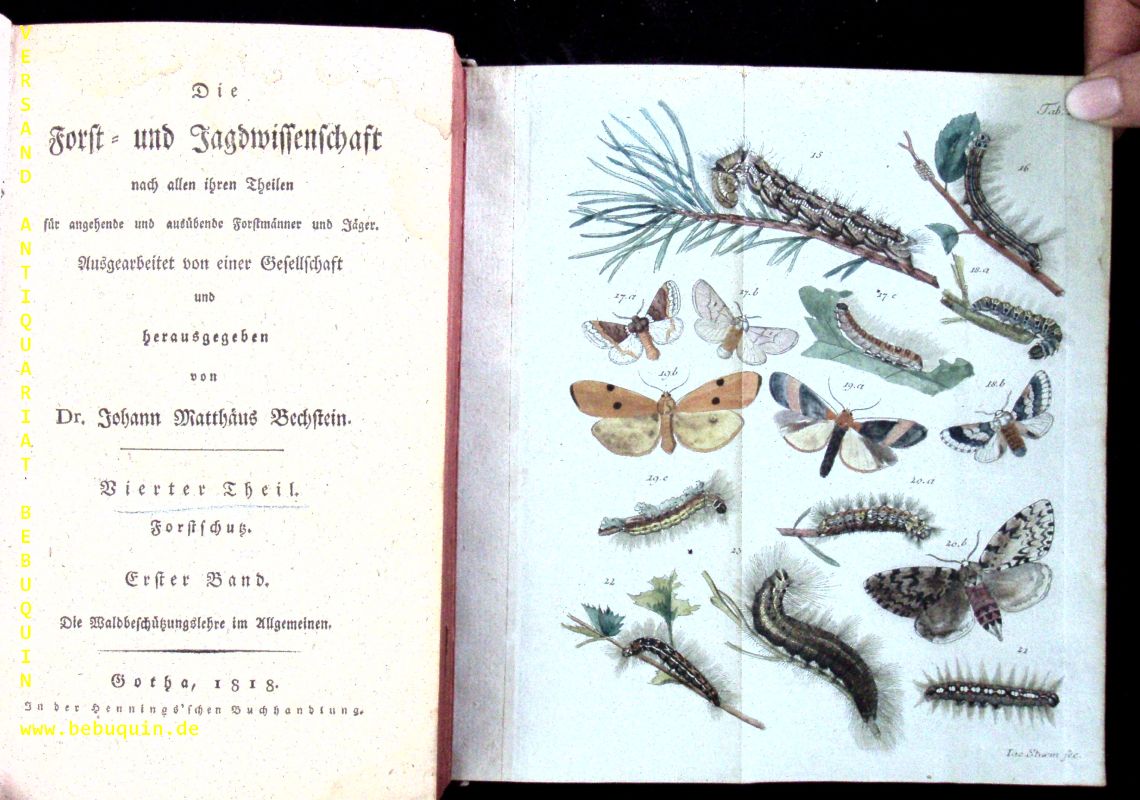 JAGD.– BECHSTEIN, Johann Matthäus: Forstschutz. Die Waldbeschützungs-Lehre. Beschreibung der schädlichen Forstinsecten nebst ihren Verhütungs- und Vertilgungsmitteln. 2 Bände in 1 Bd. Gotha, (Hennings), 1818. 8°. XII, 214, XII, 558 (8) S. mit 4 iluminirten Kupfertafeln und dreiseitigem Rotschnitt. HLdr der Zeit mit goldgeprägtem Rücken. Rücken geblichen, oberes Kap abgeplatzt, anfangs etwas schmutzrandig. = Die Forst- und Jagdwissenschaft nach allen ihren Theilen für angehende und ausübende Forstmänner und Jäger. 4. Theil. sehr seltene und gesuchte EA. Johann Matthäus Bechstein (* 11. Juli 1757 in Waltershausen; † 23. Februar 1822 in Dreißigacker bei Meiningen) war ein deutscher Naturforscher, Forstwissenschaftler und Ornithologe. Er gilt als Pionier des Naturschutzes und der wissenschaftlichen Ornithologie. Er war der Gründungsdirektor der Forstakademie Dreißigacker. (Wikipedia)