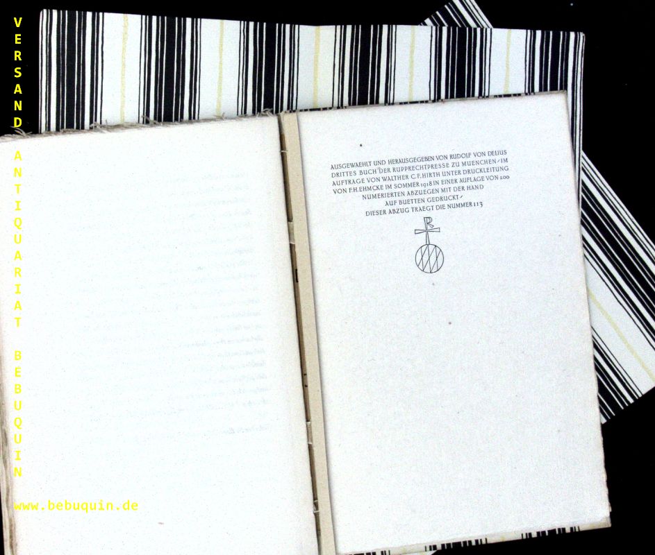PRESSENDRUCKE.– HEGEL, Georg Wilhelm Friedrich: Hegel in seinen Briefen. Hrsg. von Rudolf von Delius Muenchen (Rupprechtpresse), 1918. Gr. 8°. 81 S., [1] Bl. auf Bütten. ill. OPb. = Buch der Rupprechtpresse, 3. Nr. 113 von 200 nummerierten Abzügen. Mit zwei Pappbögen mit dem Muster des Einbandes inliegend.
