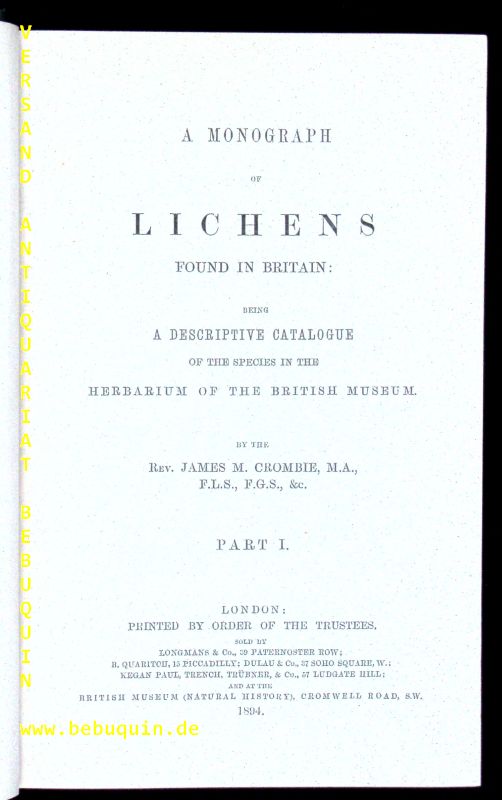PILZE- CROMBIE, J.M.: A monograph of lichens found in Britain. Part 1 of a descriptive Catalogue of the Species in the Herbarium ov the British Museum. 1. Bd (von 2). London (Longman), 1894. VIII, 519 S. mit 74 Abb. OLn mit goldgeprägtem Rücken feines Ex EA.