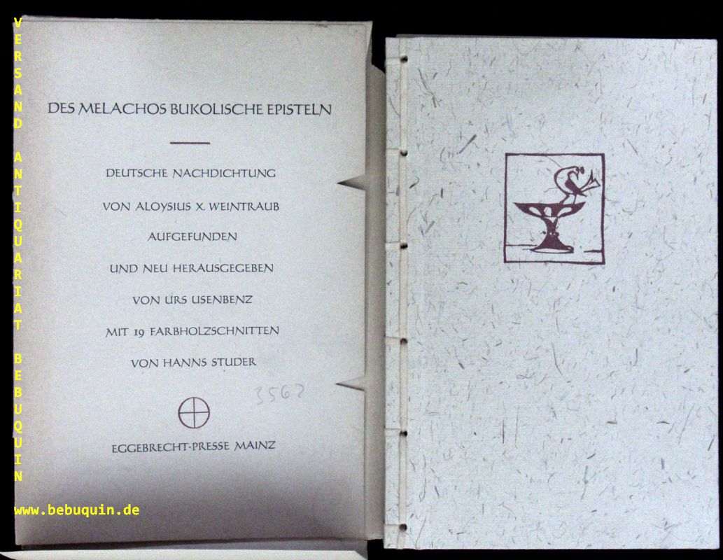 PRESSENDRUCKE.– USENBENZ, Urs: Des Melachos bukolische Episteln. Deutsche Nachdichtung von Aloysius Xavier Weintraub. Mainz (Eggebrecht-Presse), 1955. Gr. 8°. 34 S. mit 19 Farbholzschnitten von Hanns Studer. ill. OKork mit Kordelbindung in OSchuber. Schuber etws lädiert, sonst tadellos. 1. Aufl. dieser Ausgabe.