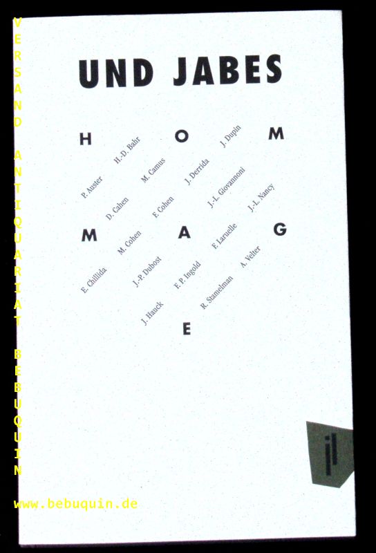LEGUEIL, J.: (Hrsg.) Und Jabès. Hommage. 1. Aufl. Stuttgart (Legueil), 1994. Gr. 8°. 196 (12) S. OKart. gutes Ex. EA.