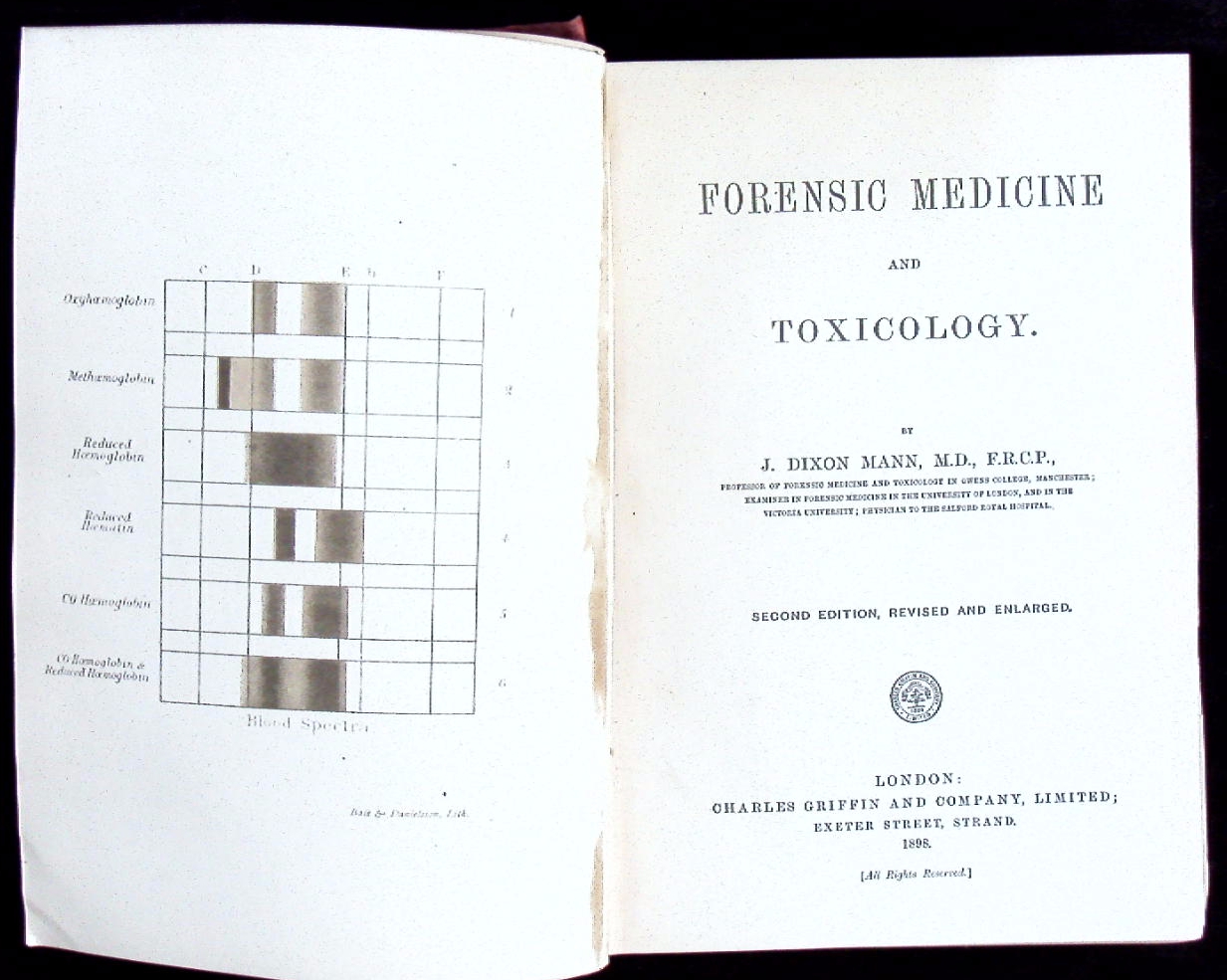 MEDIZIN.– MANN, John Dixon: Forendic Medicine ans Toxicology. 2 erweiterte Aufl. London (Griffin), 1898. Gr. 8°. XIV, 683, XVI S. mit zahlr. Abb. + 1 lithogr. Titelbild. OLn. Rücken stark geblichen und angeplatzt, vorderes Gelenk gelockert, sonst gut. Dixon Mann’s principal work, “Forensic Medicine and Toxicology”, which won him the Swiney Prize awarded by the Royal College of Physicians of London and the Society of Arts, went through four editions between 1893 and 1907 and was for many years the standard work on the subject.