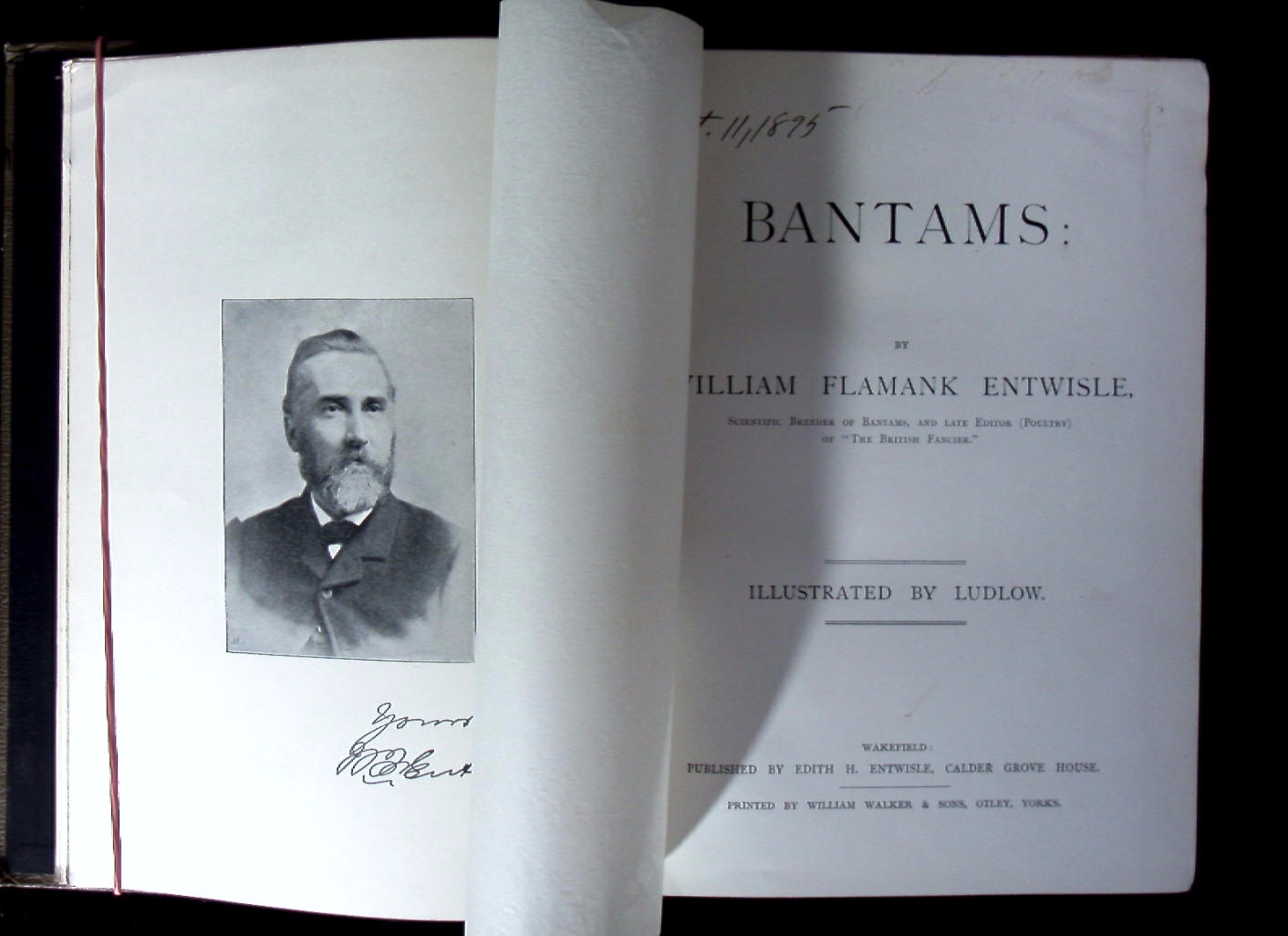 ORNITHOLOGIE.– ENTWISLE, Wiliam Flamank: Bantams. Wakefield, 1894. 4°. 132 S. mit 8 Textabb. + 13 teils gefalteten Bildtafeln von Ludlow sowie einem umfangreichem Werbeteil. OLn mit Blindprägung. Gelenke offen, sonst gut erhalten. seltene EA. Mr. Entwisle was considered ”the leading Bantam breeder in the world” and was responsible for the creation of several Bantam varieties that are still enjoyed by breeders and other Bantam enthusiasts to this day. Included in the text are discussions on Game Bantams, Malay and Aseel Bantams, Cochins, Brahmas, Sultans, Burmese and Silky Bantams, Sebright Bantams, Rosecomb Bantams, Scotch Greys, Nankins, Japanese Bantams, Frizzles, Polish Bantams, Minorcas, Leghorns, Hamburgs and other Bantams. Also included are details on breeding, rearing and exhibiting Bantams, making this one of the best historic texts on Bantams ever written. (Internet)