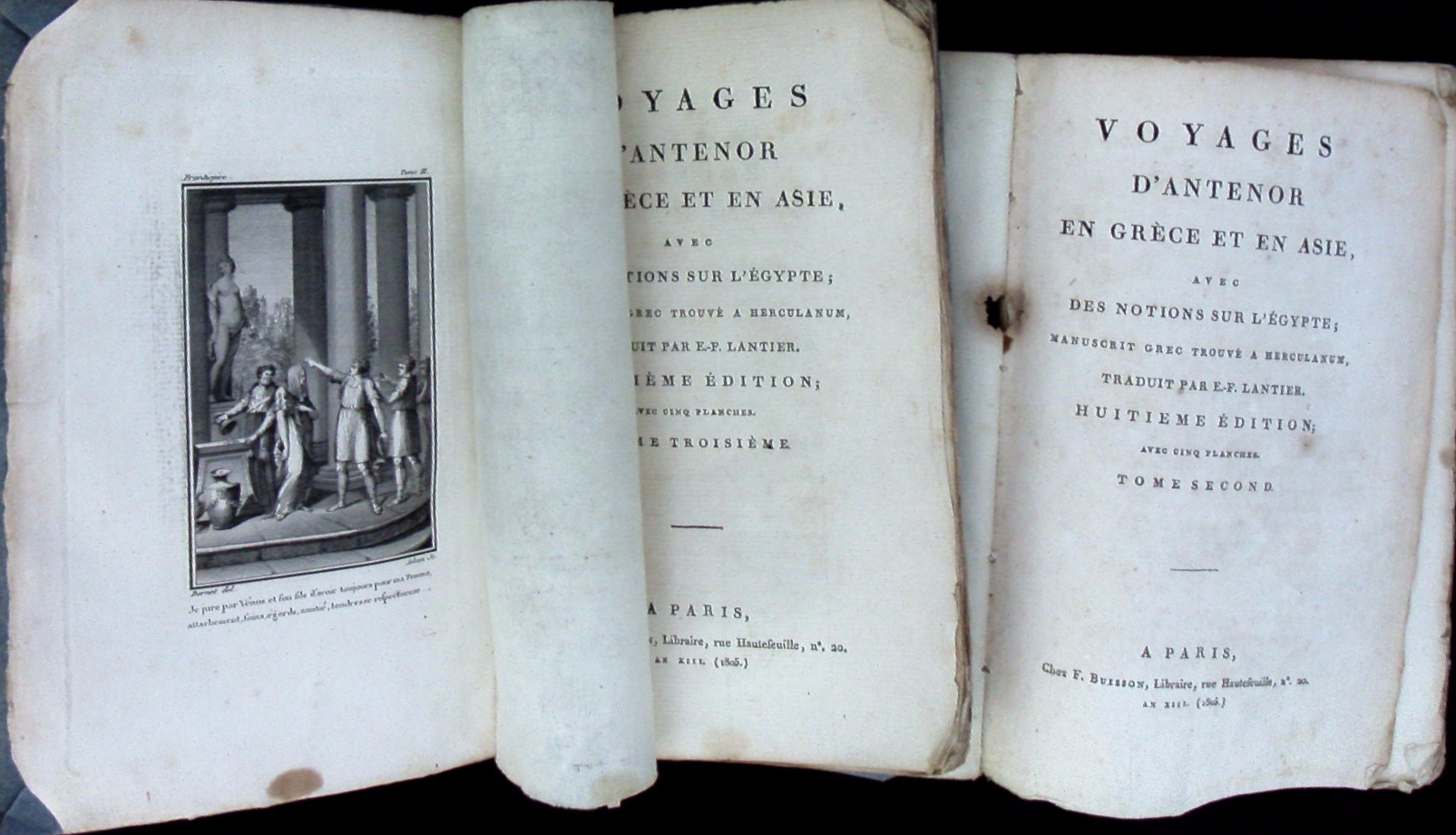 GRIECHENLAND.– LANTIER, Étienne François de: Voyages D’Antenor En Grèce Et En Asie, Avec Des Notions Sur L’Egypte. Manuscrit grec trouvé à Herculaneum T. 2 + 3. 8. éd. 2 Bände. Paris (Buisson), 1805. 394, 364 S. mit 2 Titelkupfern. Interims Broschuren. bestaubt, ein Rücken mit kleinem Fehler, unbeschnitten.