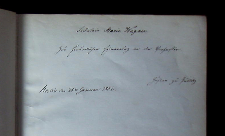 PUTLITZ, Gustav Heinrich Gans zu: Was sich der Wald erzählt. Ein Märchenstrauß. 10. Aufl. Berlin (Duncker), 1852. Gr. 8°. 68 S. mit zahlr. Textabb. + 6 Farbtafeln von A. Hindorf HLdr der Zeit mit goldgeprägtem Rücken. Kanten etwas berieben, Titelseite mit hinterlegtem Eckfehler, Blattränder gebräunt. = Illustrierte Pracht-Ausgabe. Mit einer 4zeiligen eigenhändigen dartierten und voll signierten Verfasserwidmung auf Vorsatz. Gustav Heinrich Gans Edler Herr zu Putlitz (* 20. März 1821 auf Gut Retzin, Prignitz; † 5. September 1890 ebenda) war ein deutscher Gutsbesitzer, Schriftsteller, Theaterintendant und Politiker. Von 1888 bis zu seinem Tod war er Mitglied des Preußischen Herrenhauses. (Wikipedia)