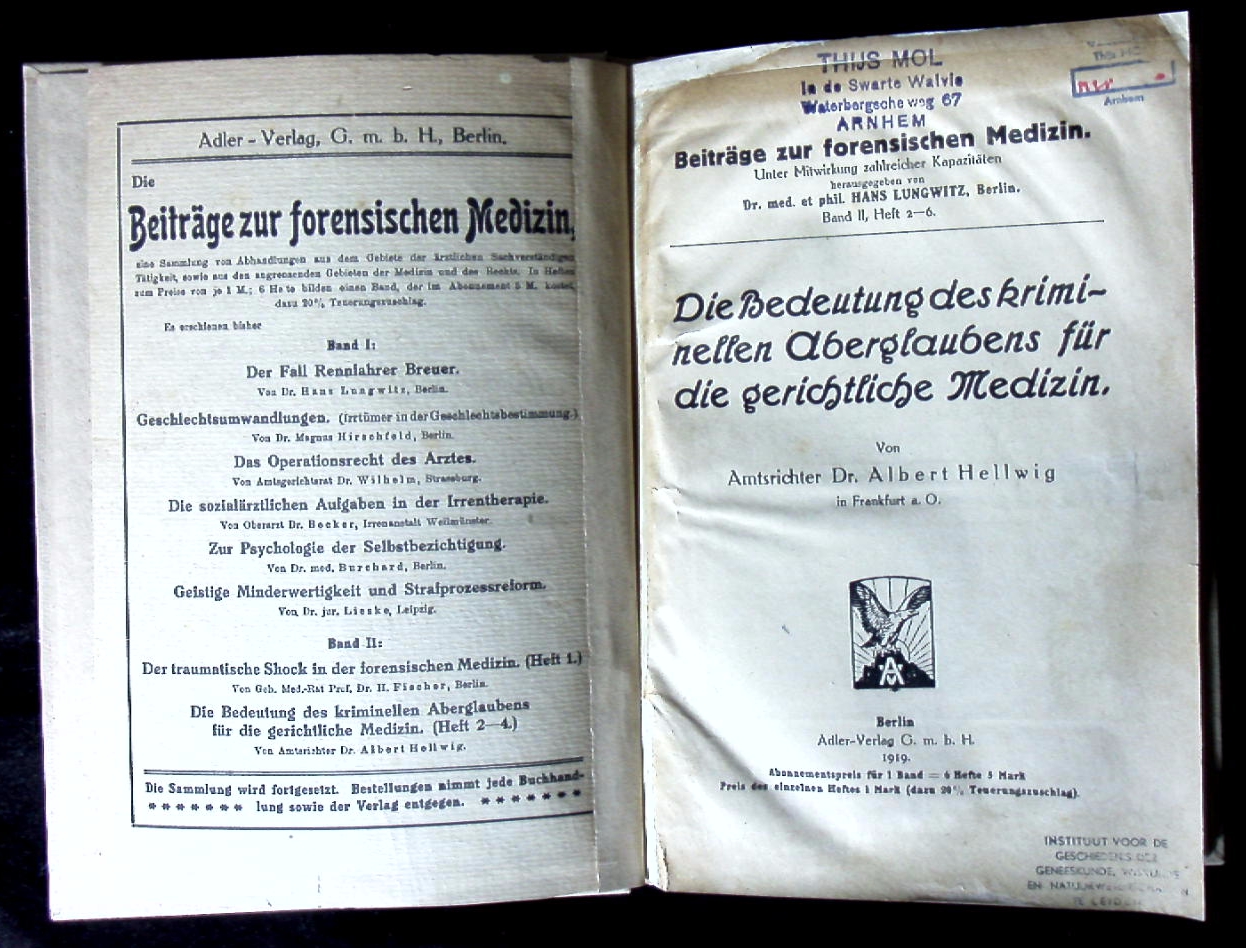 MEDIZIN.– HELLWEG, Albert: Die Bedeutung des kriminellen Aberglaubens für die gerichtliche Medizin. Berlin (Adler), 1919. 4°. 133 S. OKart mit neuem Pb. Titelseite stärker gebräunt und fachfraulich restauriert mit Bibl.St. = Beiträge zur forensischen Medizin, 2.