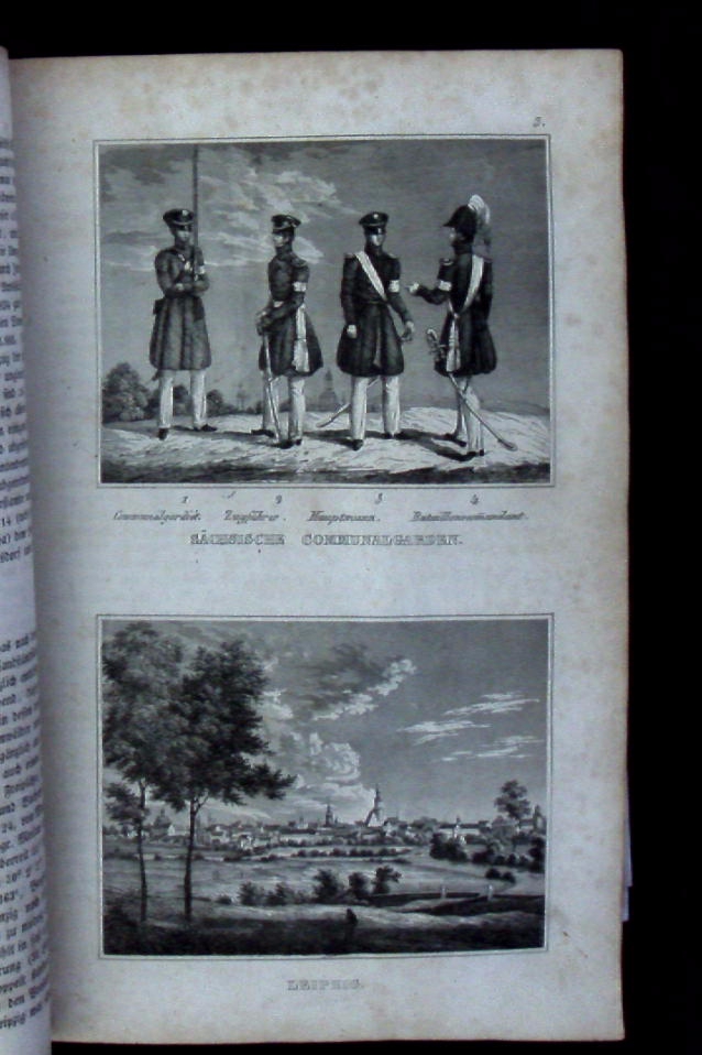 SACHSEN.– SCHIFFNER, Albert: Beschreibung von Sachsen und der Ernestinischen, Reußischen und Schwarzburgischen Lande. 2 Teile in 1 Bd. Stuttgart (Scheible), 1840. 22 x 15,5 cm. 1 Blatt, Seiten 8-800, IV, 27 Seiten; 60 Seiten (Nachträge) mit gestochenem Frontispiz, 192 Ansichten auf 96 Stahlstich-Tafeln und 2 mehrfach gefalteten, lithographierten Karten. Moderner Halblederband. Ohne den typographischen Titel. Durchgängig unterschiedlich gebräunt und braunfleckig. Die beiden Faltkarten fachgerecht aufgezogen. EA dieser reich illustrierten sächsischen Landeskunde, herausgegeben von dem Geographen Albert Schiffner (1792-1873). – Hier mit den fast immer fehlenden Karten sowie am Schluss: “Nachträge und Ergänzungen […] 1844 niedergeschrieben”. – Die reizvollen Tafeln überwiegend mit Ansichten, aber auch mit Trachten- und Uniformdarstellungen.