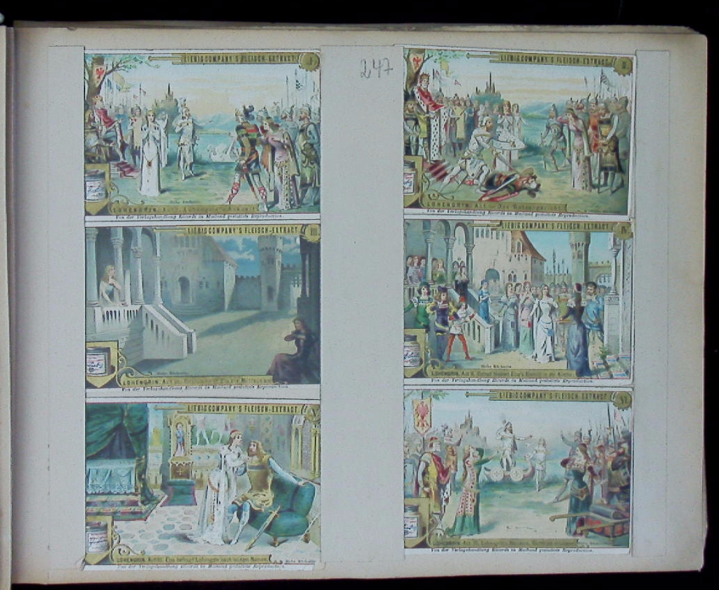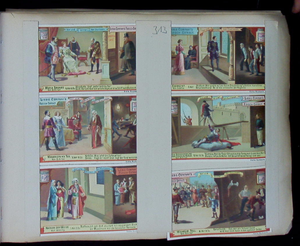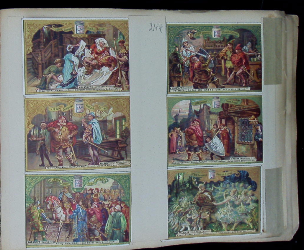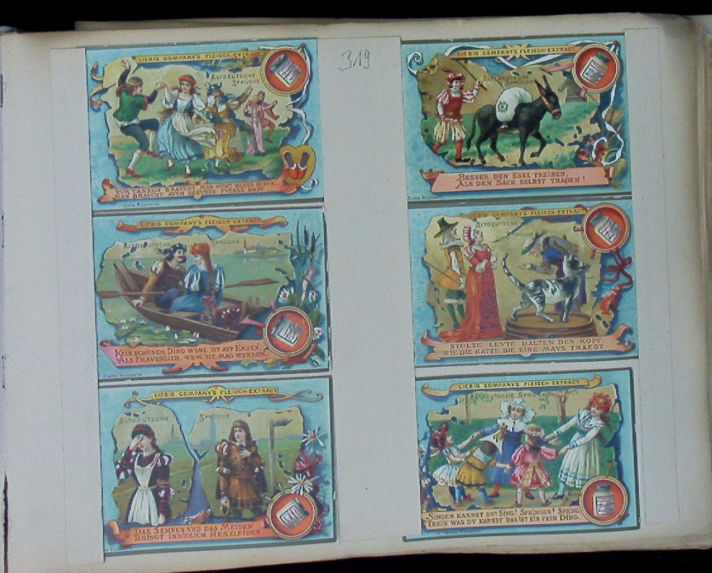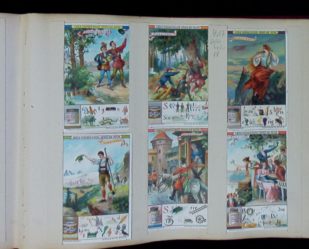 SAMMELBILDERALBEN.– LIEBIG.– Album mit Sammelbildern. Hamburg, (Liebig Company’s Fleisch-Extract), ca 1890 – 1920. Quer 4°. 68 Serien mit über 400 farb. Sammelbildern. Original Leinenalbum mit relativ seltener farbiger Einbandgestaltung mit Blume und Schmetterling. Album in ordentlicher Außenerhaltung, innen mit Streifenfixierung leicht wellig. Die Bilder überwiegend von guter Erhaltung mit einigen Beigaben. Folgende Serien sind vorhanden: 256, 341 (22,–), 247 (35,–), 317, 292 (25,–), 735, 244 (20,–), 304, 332, 260 (60,–), 270, 250, 313, 343, 342, 314 (45,–), 287, 315, 382 (25,–), 307 (1), 267 (20,–), 349, 328, 180 (40,–), 246, 461, 275 (20,–), 214 (4,5,6), 245 (1,3,4), 311, 398, 380, 302 (85,–), 319, 296, 327, 303, 277, 431, 232 (30,–), 345, 383 (20,–), 251 (25,–), 415, 280 (45,–), 190 (3), 369 (2), 184 (20,–), 249, 325, 295, 274 (25,–), 417, 286, 385, 194 (40,–), 201 (40,–), 334 (25,–), 282, 252 (22,–), 374, 362, 241 (25,–), 321, 276 (30,–), 254 (30,–), 348, 569, 728, 701, 731 (22,–) (In Klammern sind die jeweils fehlenden Bilder aufgeführt bzw. die Preise laut Liste).