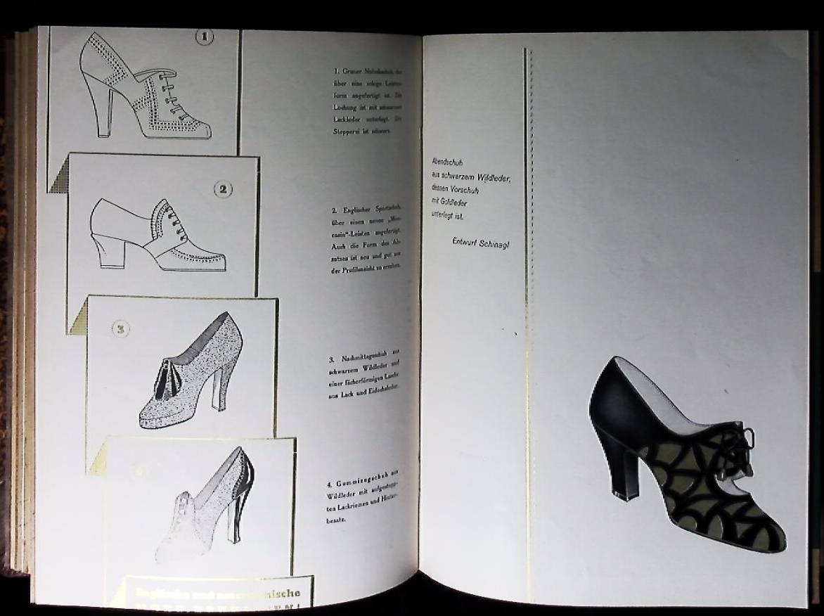 MODE.– DAS ABC DER SCHUH-FABRIKATION 1936.– 7 Hefte der Fachzeitschrift für Schuhfabrikanten: Nr. 5, 7, 9, 10, 11, 12, 13. Erfurt (Hugo Seiler), 1936. 4°. ca 400 S. mit zahlr. Abb. + zahlr. gediegene Farbtafeln mit Designerschuhe. HLdr der Zeit. sehr gutes Ex. = 1. Halbjahr 1936 mit Inhaltsverzeichnis. absolut rares Schuhwerk mit folgenden Hefttiteln: 1.+ 2. Stanzerei-Spezialnummer + Die Bodenbestandteil-Zurichterei + Spezialnummer der Absatzbau etc.