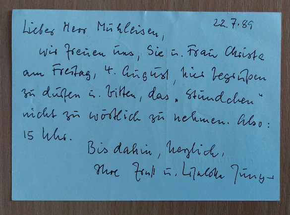JÜNGER, Liselotte: 8zeilige eigenhändige von Liselotte für beide Jüngers signierte und datierte -Postkarte an Horst Mühleisen. „… und bitten das „Stündchen nicht zu wörtlich zu nemen.“ Willimngen, 22.7.1989. Vordruck Postkarte. gelaufen mit Marke. gutes Ex.