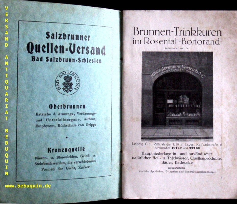 LEIPZIG.– BRUNNEN-TRINKKUREN IM ROSENTAL „BONORAND“.– Leipzig (Helm), 1928. 32 S. mit zahr. Abb., einer farb. Werbebeilage und einer Karte vom Rosental. ill. OKart. am Rand etwas gebräunt. Sehr seltene EA über den Mineralwasserausschank im Bonorand. Das Café Bonorand war eine im Leipziger Rosental als Café, Konditorei und Konzerthaus genutzte Einrichtung.