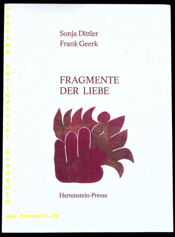 PRESSENDRUCKE.– DITTLER, Sonja + GEERK, Frank: Fragmente der Liebe. Pforzheim (Hertenstein-Presse), 1996. Fol. 9 ungez. Bl. mit 6 farbigen eigenhändig signierten Orig.-Linolschnitten von Axel Hertenstein. ill. OKart. tadellos. Nr. e.a. von 300 numerierten und von Autor und Künstler signierten Ex. der EA.
