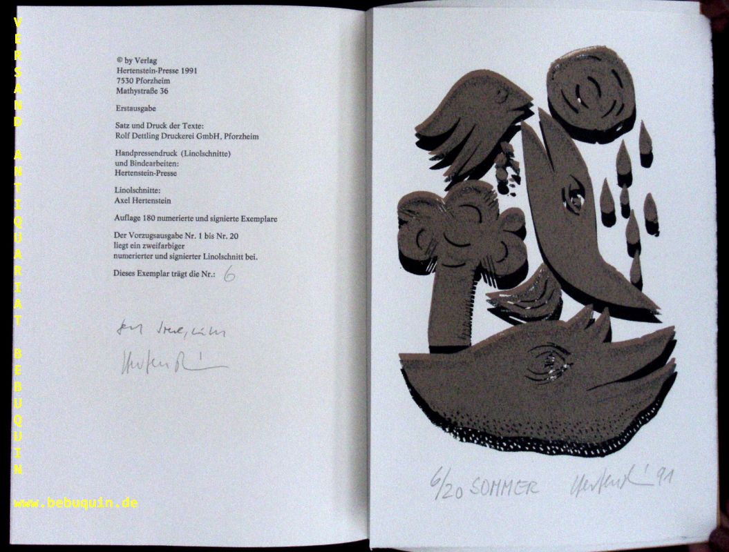 PRESSENDRUCKE.– BRECHBÜHL, Beat: Das Wesen des Sommers mit Zuckerfrau. Pforzheim (Hertenstein-Presse), 1991. 4°. 8 Bl. m it 4 farb. Linolschnitten von Axel Hertenstein. ill. OKart. tadellos. Nr. 6 von 20 numerierten Ex. der EA mit den eigenhändigen Signaturen von Autor und Künstler und einem beiliegenden numerierten und signierten Linolschnitt.