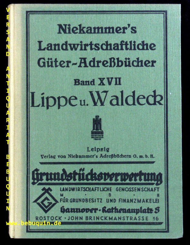 LIPPE.– NIEKAMMER.– LANDWIRTSCHAFTLICHES ADRESSBUCH DER RITTERGÜTER, GÜTER UND GRÖSSEREN HÖFE DER FREISTAATEN LIPPE-DETMOLD NEBST SCHAUMBURG-LIPPE U. WALDECK-PYRMONT.– Band XVII. Einschließlich der Preußischen Gebiete Deisfeld, Eimelrod, Hemmimnghausen und Hoeringhausen. Verzeichnis der Rittergüter und Güter bis zur Größe von ungefähr 15 ha … Angabe der Besitzer, Pächter und Verwalter, der Post-, Telegraphen- und Eisenbahnstationen … einem alphabetischen Orts- und Personenregister, sowie 1 (von 2 ) mehrfarb. Faltkarten. Hrsg. von Julius Ernst u.a. Leipzig (Reichenbach), 1921. Gr. 8°. XVIII, 158 S. + 1 farb. Faltkarte. ill. OLn. Rücken geblichen, wie immer ohne die auf dem Titel angekündigte zweite Karte. EA.