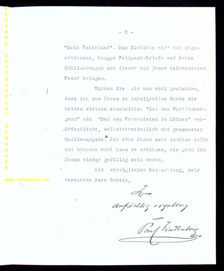 LINDENBERG, Paul: 2seitiger voll signierter Brief an einen verehrten Doktor: „Vor Jahresfrist besprach ich mit Ihrem Verleger die Herausgabe eines Büchleins „Der Kaiser war bei uns!“ Berlin, 1917. Gr. 8°. 2 S. auf Kopfbogen. seitlich gelocht. Paul Lindenberg (* 11. November 1859 in Berlin; † 31. Dezember 1943 ebenda) war ein deutscher Journalist und Schriftsteller. (Wikipedia)