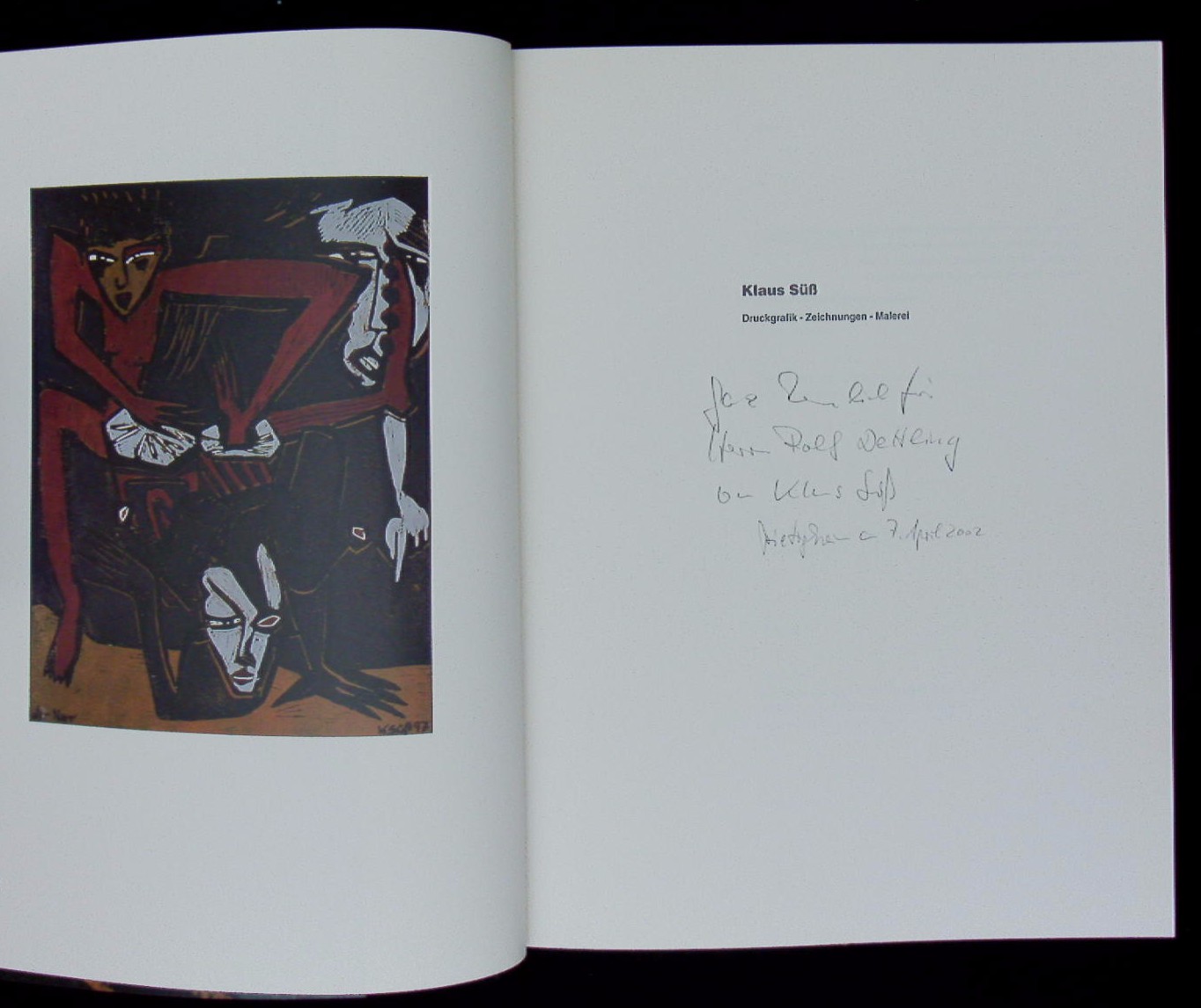 SÜSS, Klaus: Druckgrafik, Zeichnungen, Malerei. Chemnitz (Galerie Oben), 1997. Gr. 4°. 73 S. mit zahlr. farb. Bildern und Bildtafeln. farb. ill. OKart. tadellos. EA mit einer 4zeiligen voll signierten und datierten Widmung des Künstlers auf Titelseite.