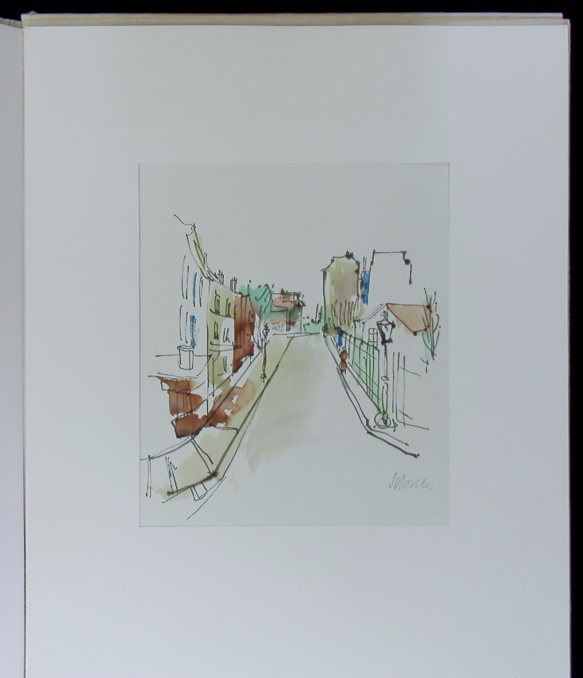 SCHÖTTLER, Walter: Französische Skizzen. Mit einem Nachwort von Wolf von Niebelschütz. Essen (Industriedruck), o.J. Fol. 2 Bl., und 4 (von 6) Bl. mit farb. Bildtafeln in Passepartous. OKart. mit mont. Farbbild. Die Mappe mit Besitzvermerk, Deckelbild mit kleinem Fehler, es fehlen zwei Aquarelle. Nr. 94 der EA mit der eigenhändigen Signatur des Künstlers am Druckvermerk.